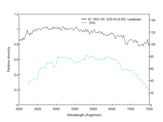 So S5 1803+78 dimmed after the flare in Mid April, but never quite reached its usual minimum, instead it made a "V shape recovery" and rebrightened steadily .... last night it was just a few 0.1 mag below its maximum during the latest flare event. No gamma ray flare has been reported on ATEL yet, I'm not sure whether that's because there was none, or the source hasn't just yet been revisted or maybe it's not important enough to report? Anyway, another chance to try low-res spectroscopy perhaps.
