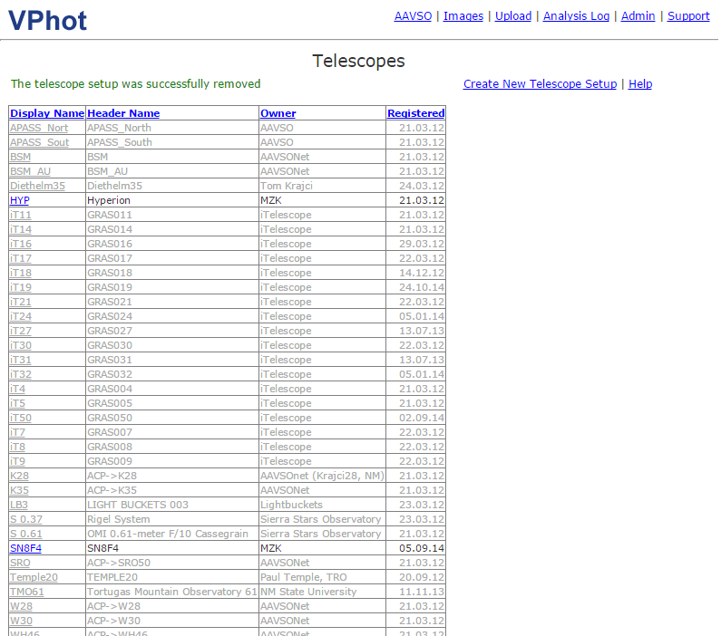 As has been mentioned recently in other posts, about 15% of images uploaded to VPhot fail to plate solve mainly because they do not provide an image scale associated with their VPhot Telescope Setup (under admin). Lack of this one value causes these images to undergo a lengthy but unsuccessful plate solution process (3 catalogs x 60 seconds each) with a default image scale (2 arcseconds per pixel) which fails 90% of the time but not without a significant expenditure of time. The arithmetic doesn't lie. If you upload 100 images without an image scale present in your Telescope Setup, I'm sure you can see that up to 180s (3 minutes) of precious processing time are wasted for each image or a total of up to 300 minutes (5 hours)! We have tried workarounds for this problem but concluded that the effort need to re-write the code to simplify the experience of a few users who do not spend any time reading about the operation of VPhot but just hope that a black box will produce a valid solution without any understanding of the process, was not worth it! ![]()